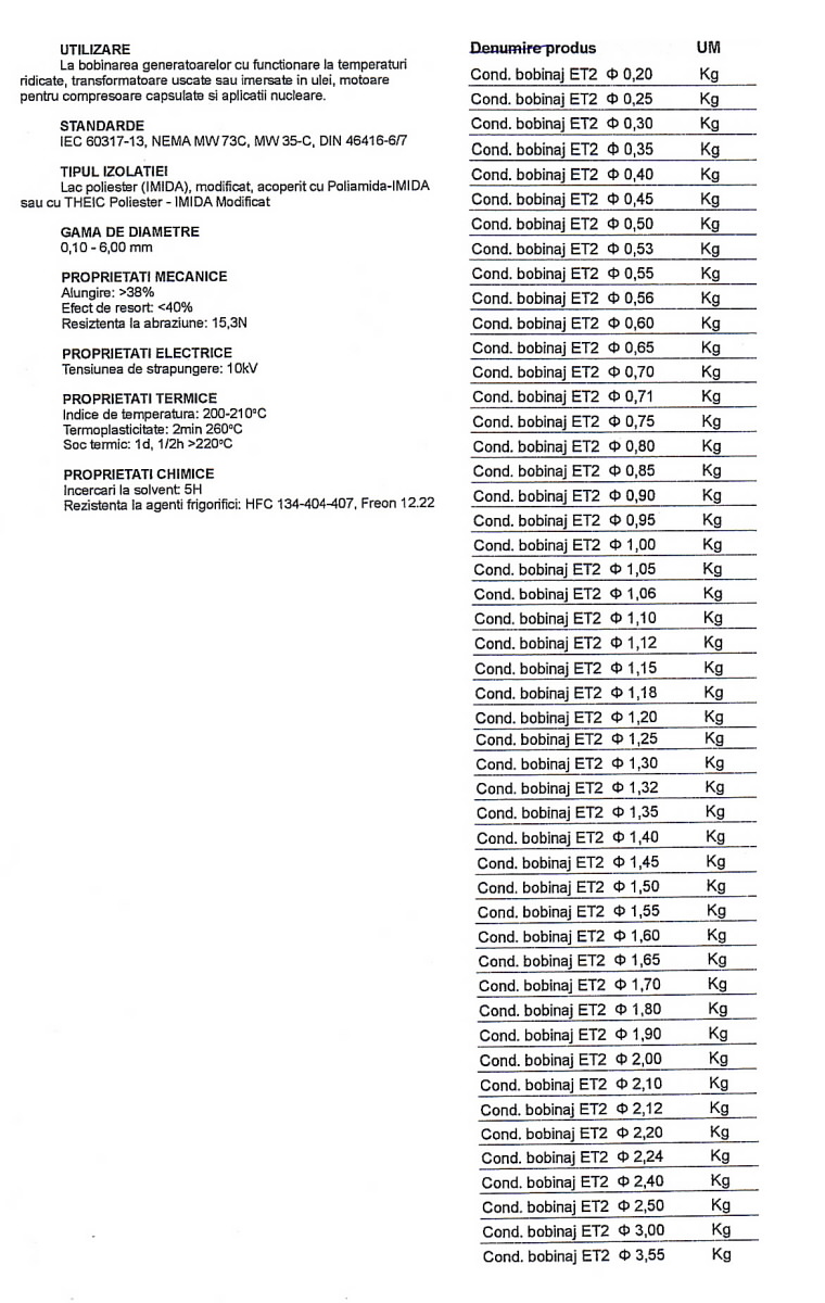 Standarde: IEC60317-13, nema mw 73c, mw 35-c, din 46416-6/7 Tipul Izolatiei: Lac poliester (IMIDA), modificat, acoperit cu Poliamida-IMIDA sau cu THEIC Poliester - IMIDA Modificat Gama de diametre: 0.10 - 6.00 mm Proprietati mecanice: Alungire >38%; Efect de resort <40%; Rezistenta la abraziune = 15.3N Propietati electrice: tensiune de strapungere = 10kV Propietati termice: Indice de temperatura: 200-210oC; Termoplasticitate: 2min 260oC; Soc termic: 1d, 1/2h>220oC Propietati chimice: Incercari la solvent: 5H; Rezistenta la agenti frigoritici: HFC 134-404-407, Freon 12.22