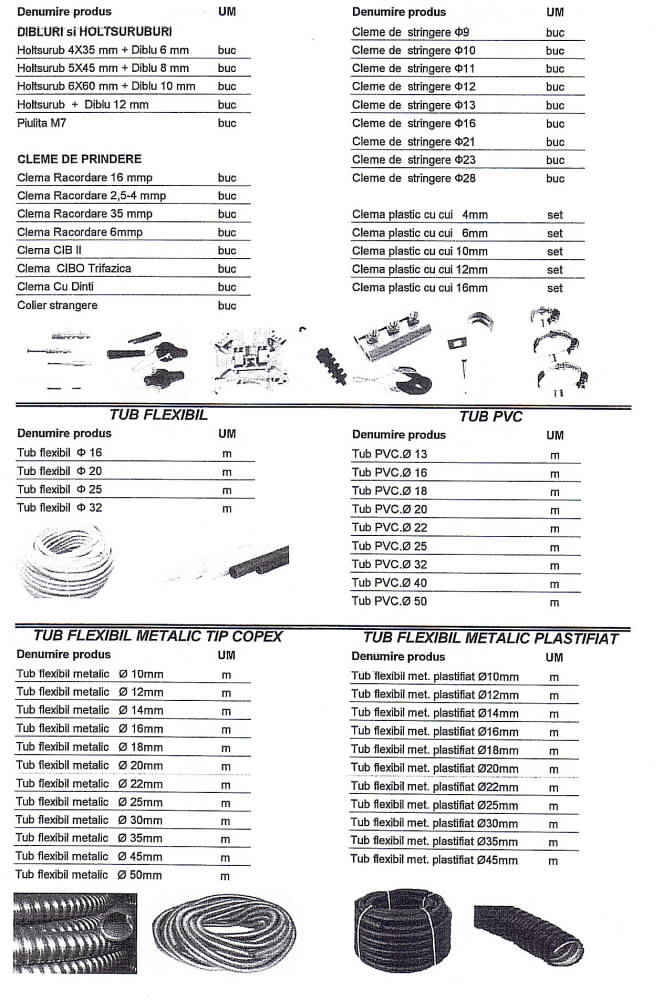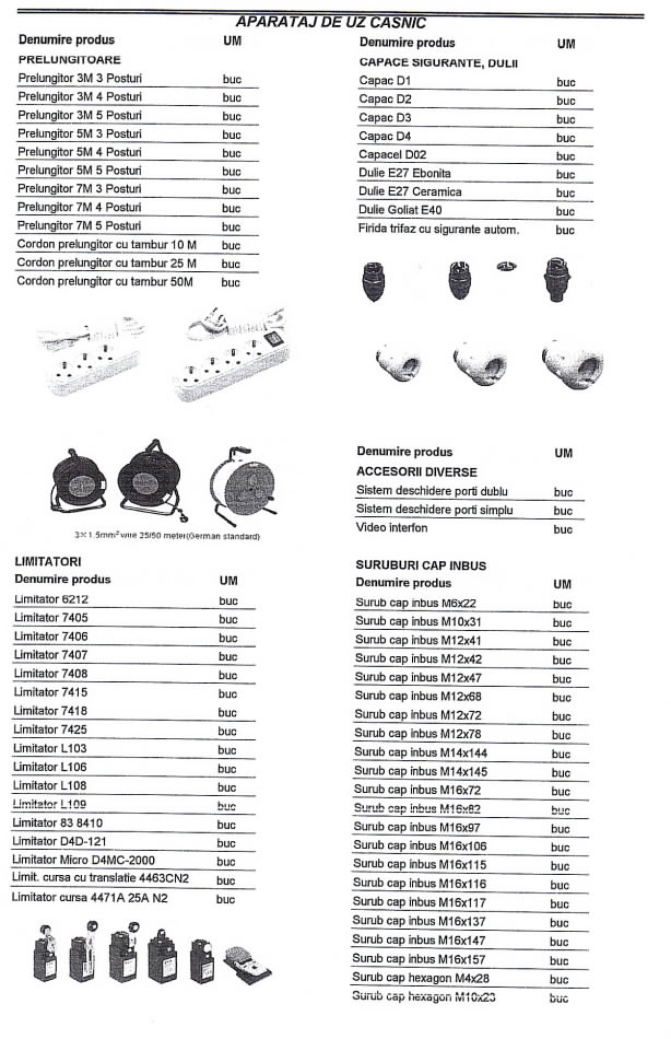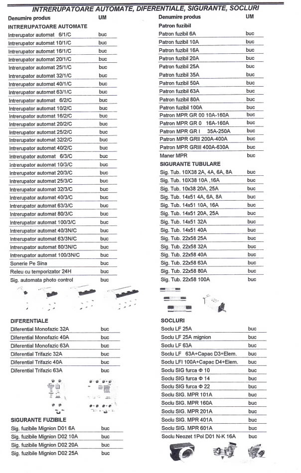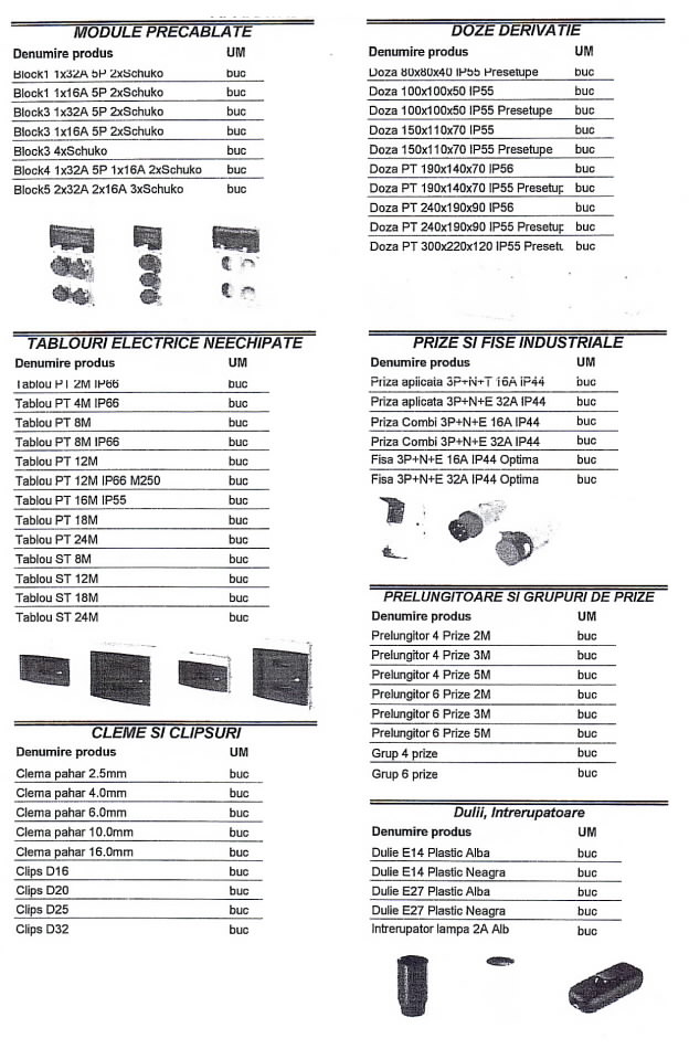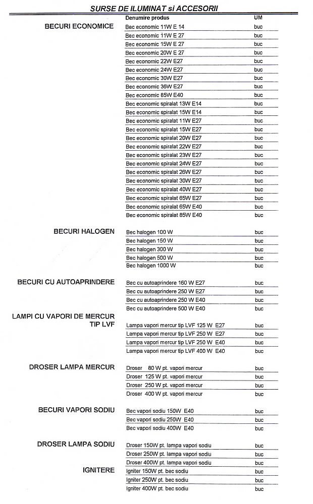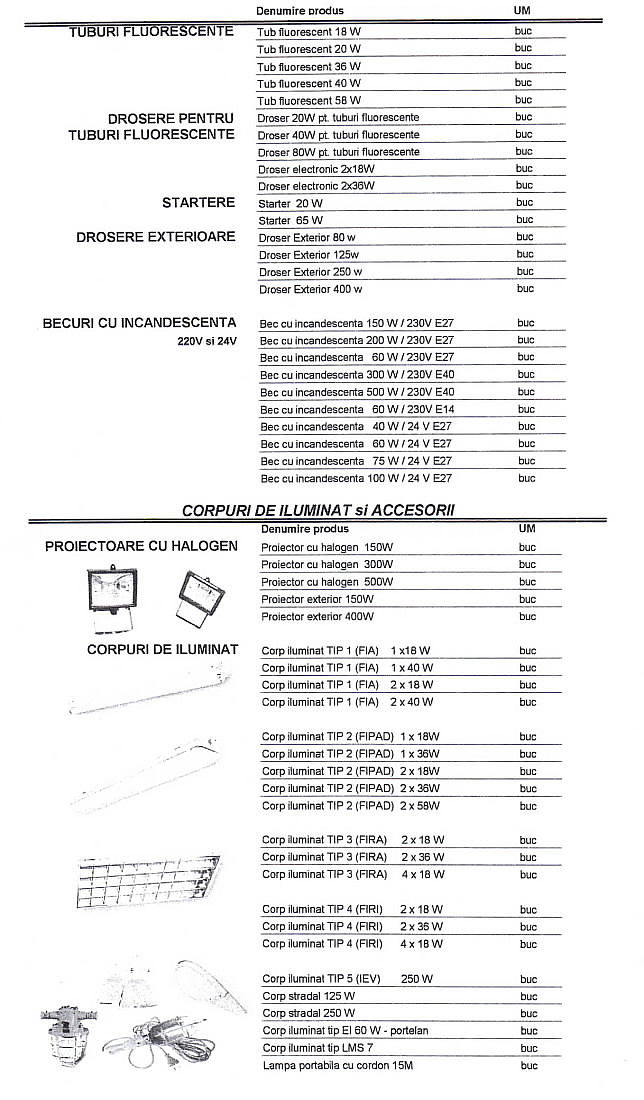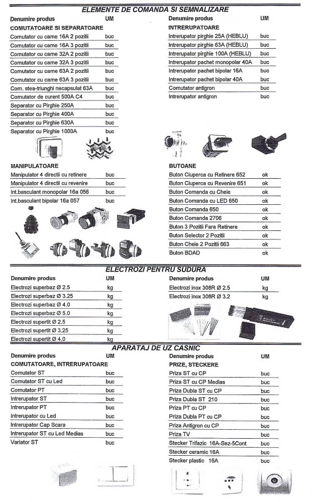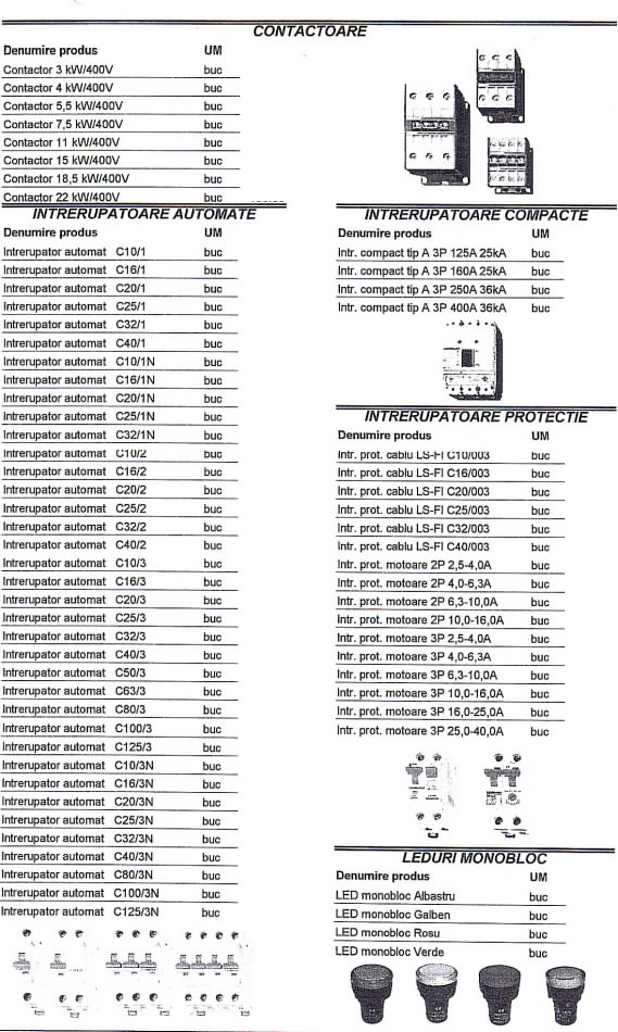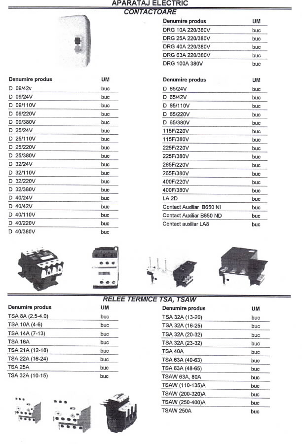 Oferta Sirmalex Total Grup de aparataj electric si surse de iluminat cuprinde: contactoare, relee termice TSA, TSAW, intrerupatoare automate, transformatoare, contoare, tablouri electrice, blocuri de masura si protectie, diverse accesorii pentru echipamente electrice, elemente de comanda si semnalizare, electrozi pentru sudura, aparataj de uz casnic, aparate de masura si control, doze, prize si fise industriale, becuri economice, halogen si cu autoaprindere, lampi cu vapori de mercur, drosere, becuri cu vapori de sodiu, proiectoare, etc.
