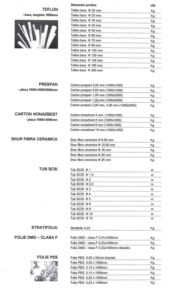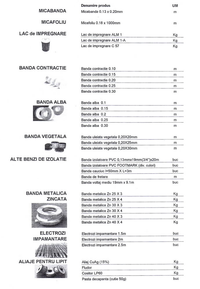 Marsit si Marsit armat, Teflon, Prespan, Carton nonazbest, Snur fibra ceramica, Tub SCSI, Stratifoliu, Folie DMD clasa F, Folie pes, Micabanda si Micafoliu, Lac de impregnare, Banda contractie, Benzi de izolatie, Banda metalica zincata, Electrozi impamantare, Aliaje pentru lipit, etc.